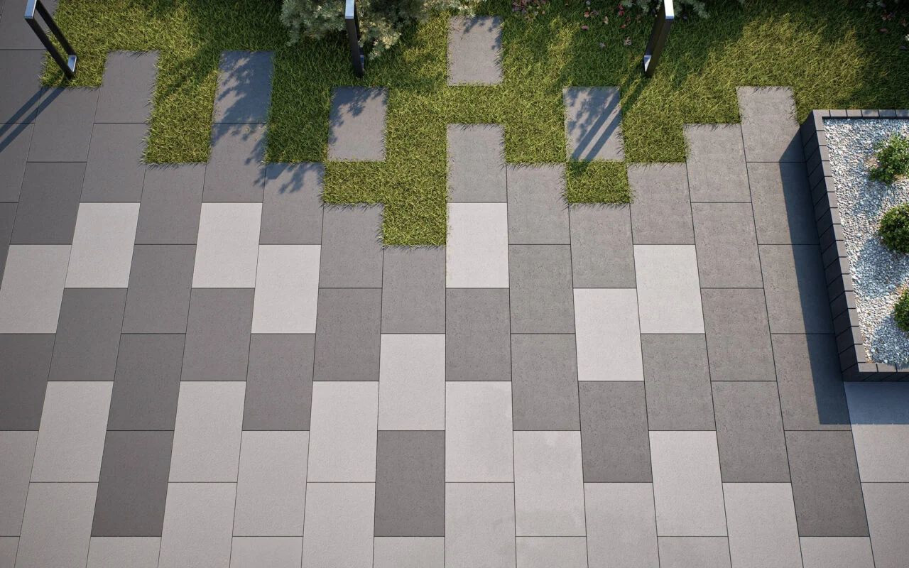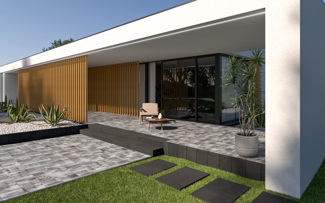 Duże płyty ENTRADA to idealny wybór na przydomowe podjazdy, altany czy wiaty. Dzięki masywnej konstrukcji i zastosowaniu nanofazy, płyty zapewniają perfekcyjnie gładką nawierzchnię, która doskonale komponuje się z eleganckimi stopniami schodowymi Ariba.