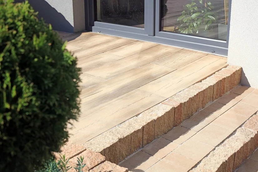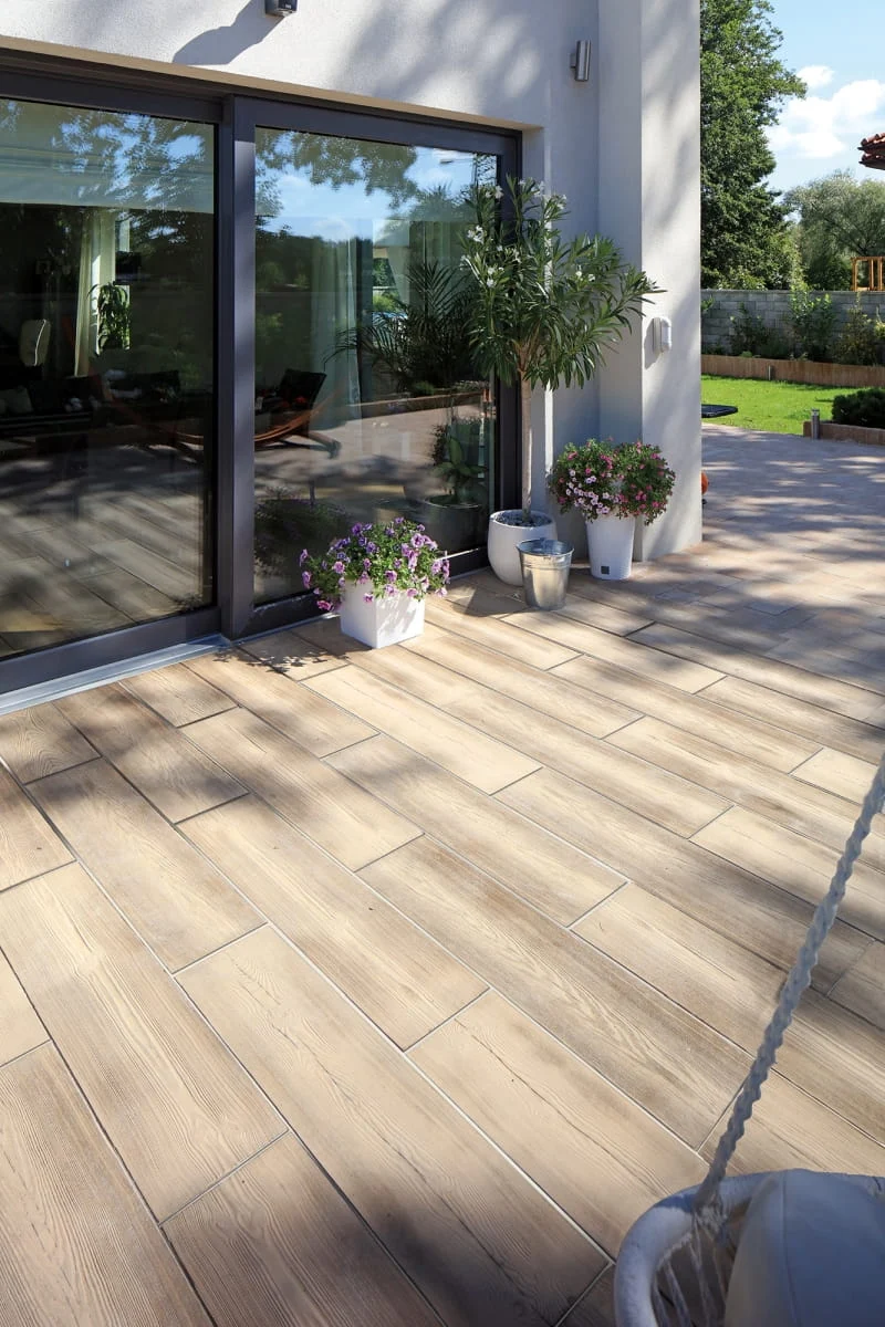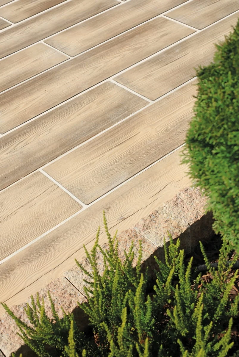 Płyta tarasowa LIRA 70x25x4cm o fakturze drewna ogrodowego firmy Polbruk. Lira to unikatowa betonowa deska ogrodowa, która do złudzenia przypomina drewno. Posiada spękania, słoje, sęki, a nawet fakturę i polecana jest do budowy ścieżek ogrodowych metodą „step by step”.